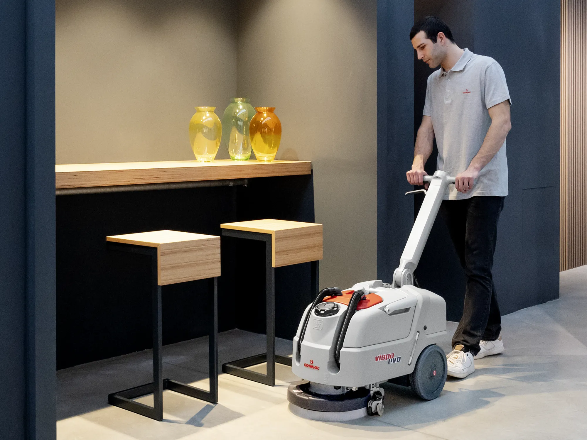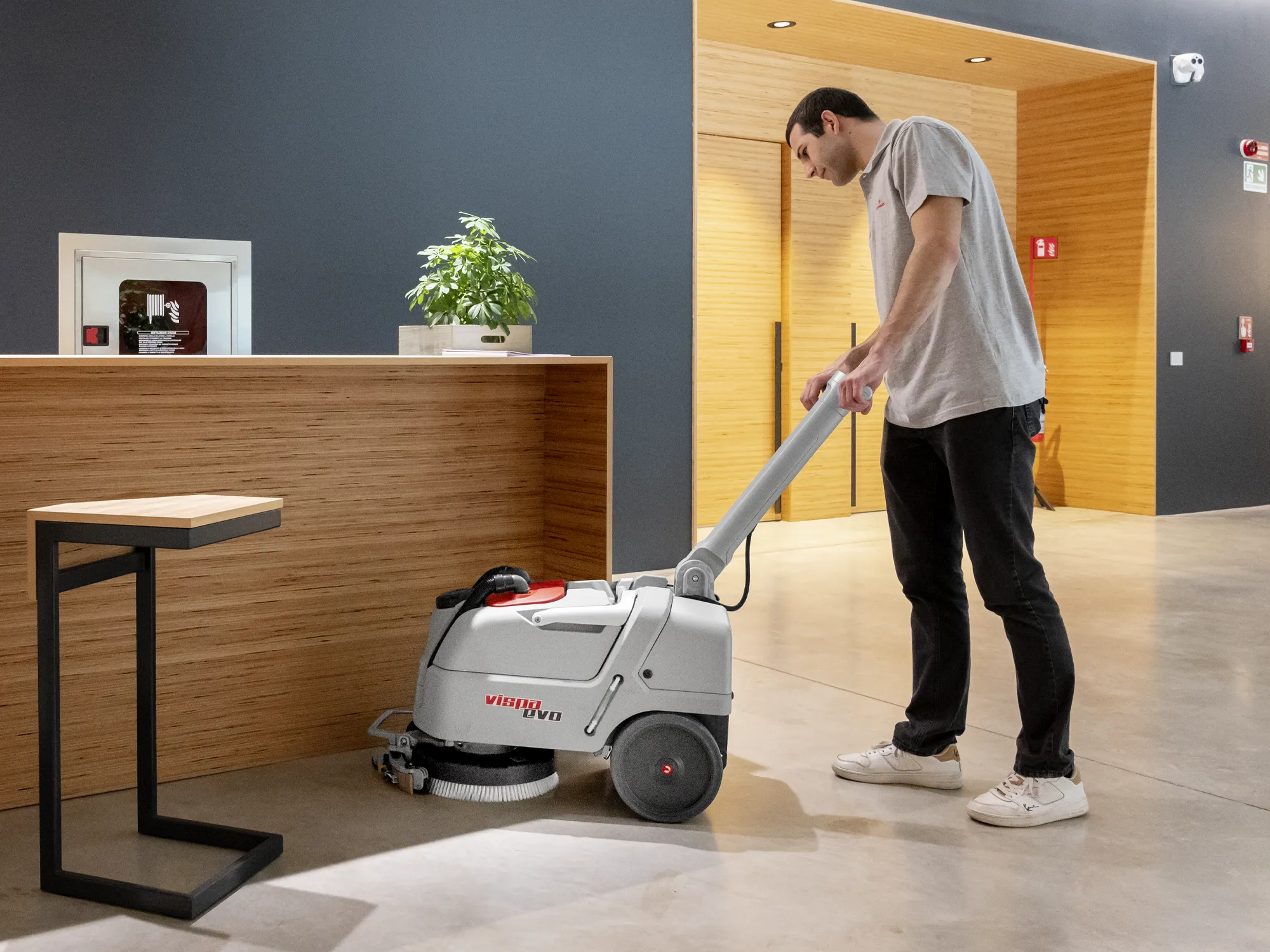 Vispa EVO is the professional floor scrubber suitable for maintenance cleaning of floors up to 1300 sq.m. and is available in a battery-powered scrubbing version.