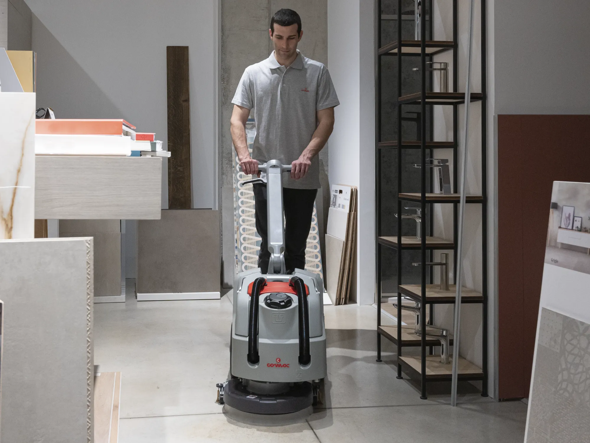 Vispa EVO is the compact, powerful professional scrubbing machine that's up to tackling the most stubborn dirt. It's ideal for the maintenance cleaning of small and medium-sized areas, even when cluttered.It's the evolution of the compact Comac scrubbing machines, as it offers the many well-known characteristics of walk-behinds, combining agility, power, reliability and technological innovation in a unique example of pure user pleasure.