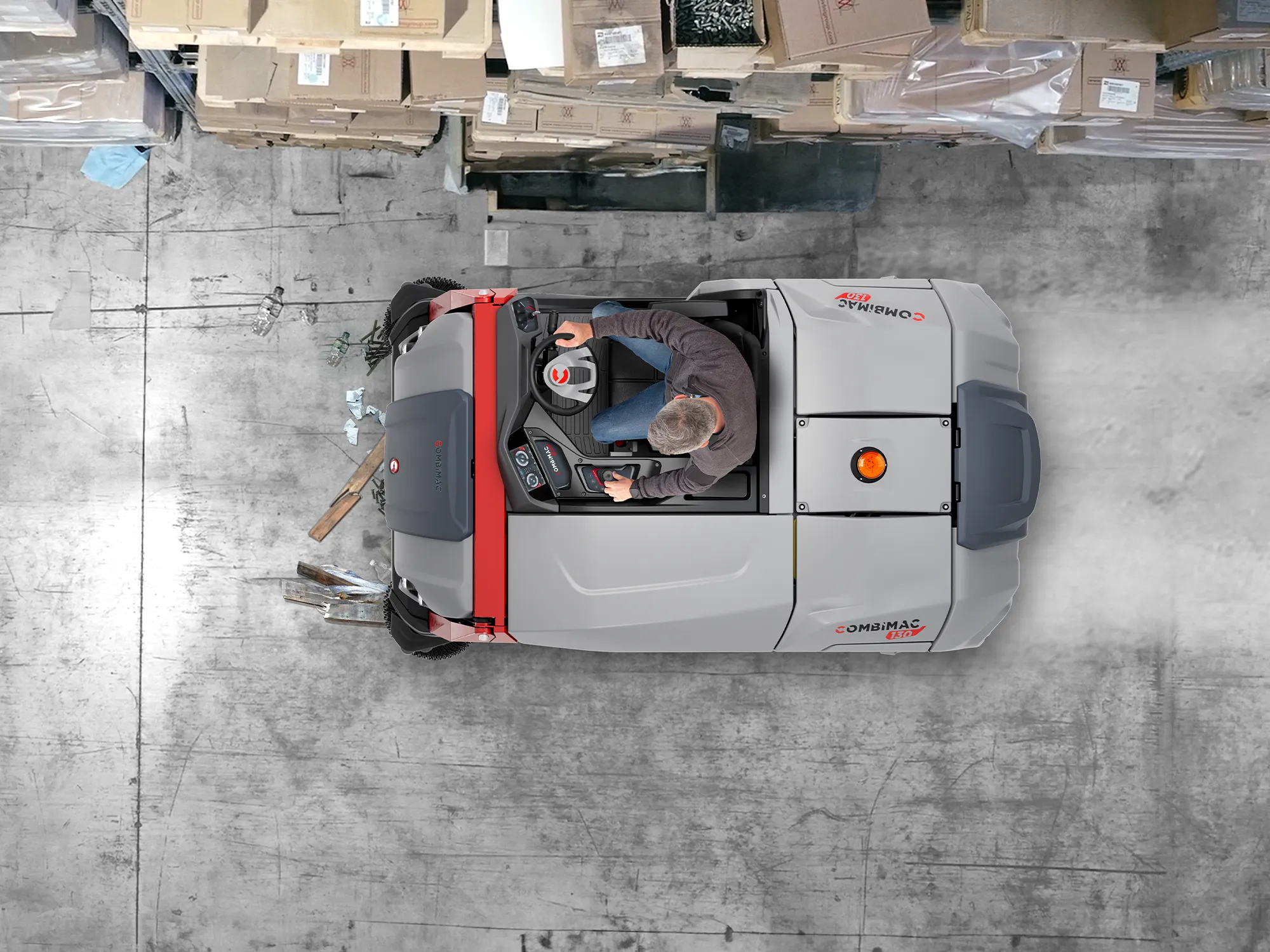 System zamiatania Combimac to zamiatarka wyposażona w dwie szczotki boczne i dwie przeciwbieżne szczotki cylindryczne. Może skutecznie zbierać wszelkiego rodzaju zanieczyszczenia: kurz, lekkie przedmioty większych rozmiarów, takie jak puszki, małe butelki lub liście, ale także te cięższe jak na przykład kamienie, fragmenty drewna lub owoce. Moduł myjący Combimac to przemysłowy automat szorujący, składający się z czterech szczotek tarczowych, które rozprowadzają i przenoszą roztwór myjący do systemu ssącego, pozostawiając podłogi idealnie czyste i suche.