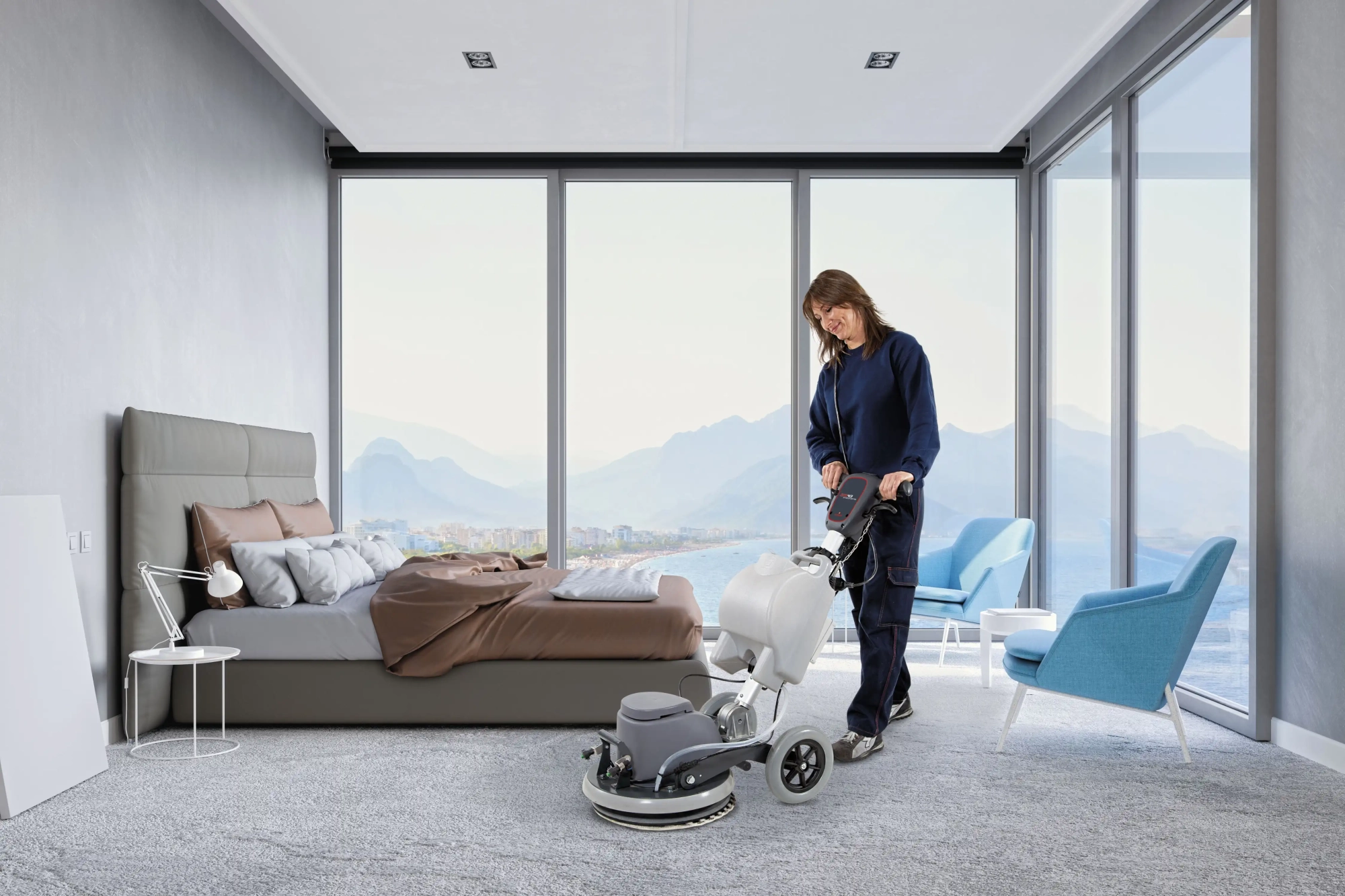 - Włókna podłóg dywanowych i chodników zostają wyczyszczone i podniesione dzięki wibracjom, a cząsteczki brudu są usuwane nawet z głębokich warstw wykładziny